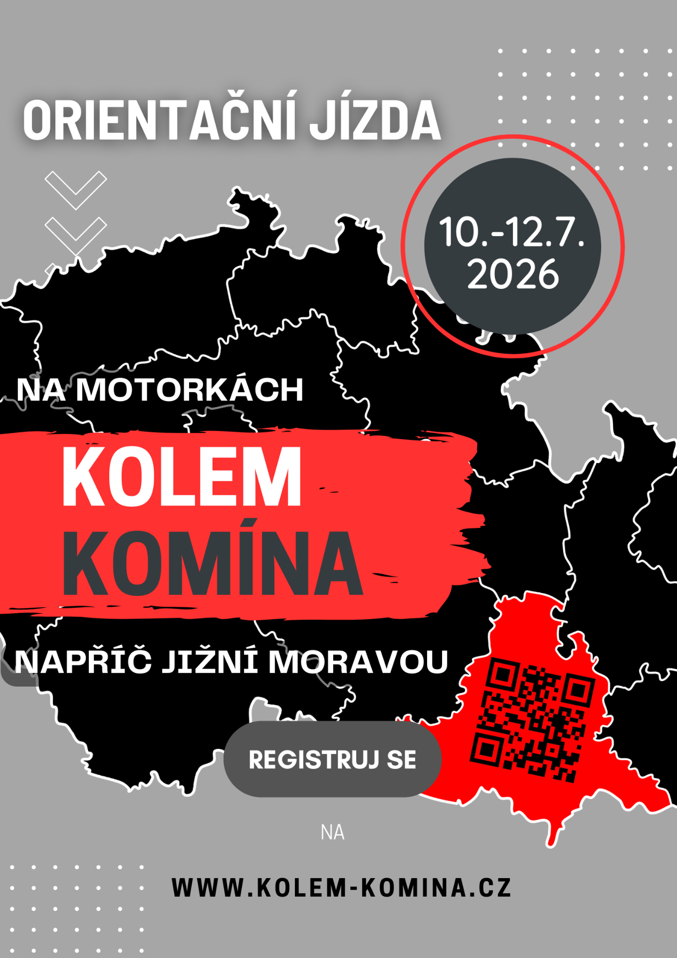 Orientační jízda KOLEM KOMÍNA je každoroční motorkářská událost, která se letos koná v termínu 10. až 12.7.2026, na které bys určitě neměl chybět, pokud máš rád krásná místa, dobrodružství, zábavu, dobré jídlo, pití, lidi se stejným zápalem do motorek a občas trochu toho bloudění.